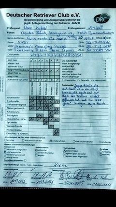 Femininer Kopf, korrekt im Ausdruck, gut gelagerte Schulter, gerade Oberlinie, etwas lang in der Lende. Gute Knochensubstanz, korrekt angesetzte und getragene Rute. Rechte Vorderpfote etwas viel weiß, bewegt sich gut.
