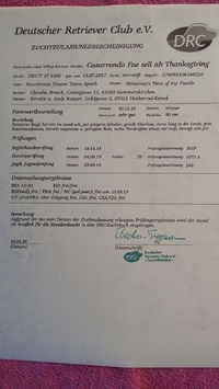 Femininer Kopf, korrekt im Ausdruck, gut gelagerte Schulter, gerade Oberlinie, etwas lang in der Lende. Gute Knochensubstanz, korrekt angesetzte und getragene Rute. Rechte Vorderpfote etwas viel weiß, bewegt sich gut.